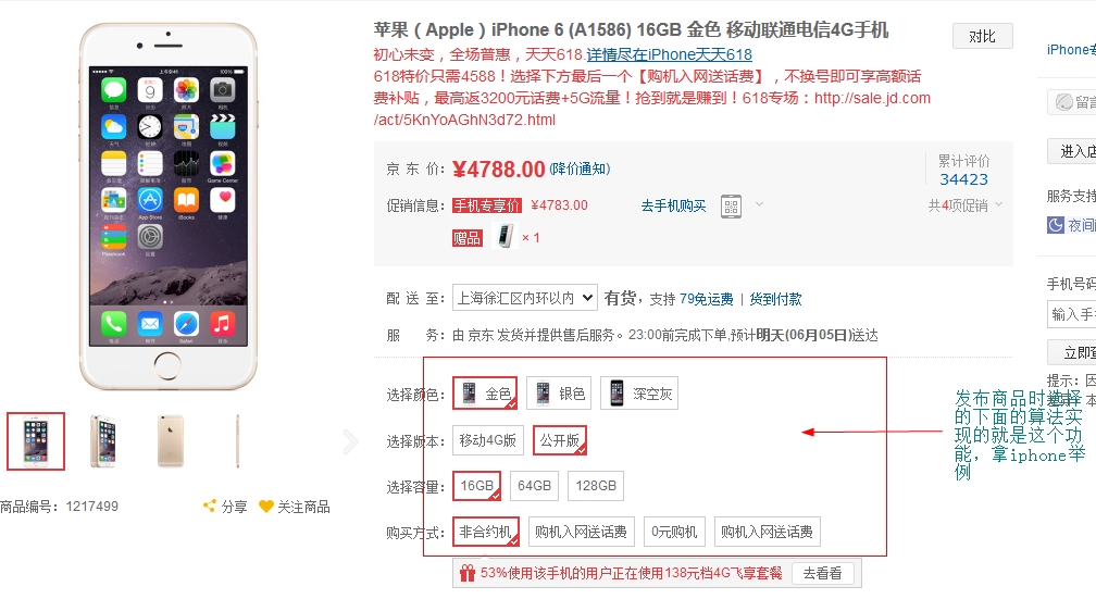 電商網站的商品發布功能,類似京東的商品詳細頁,如下圖,這樣的可選擇功能,在後台是如何生成的呢,其實你看到的一個iphone6在發布時並不只是發布一個商品,而是很多個,因為每一個選擇出來的iphone6價格是不一樣的,那麼發布商品時這些可選擇項又是從一堆屬性和屬性值中挑選出來的,問題來了,發布時挑選的屬性個數是不一樣的,屬性值也是不一樣的,那麼生成的商品個數是根據屬性和屬性值組合出來的。