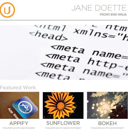 <div class="container"> <div class="row"> <div class="col-md-3"> <img src="http://placehold.it/150x150"> </div> <div class="col-md-9"> <h1>Jane Doette</h1> <h3>front-end ninja</h3> </div> </div> <hr> <div class="row"> <div class="col-md-12"> <img src="http://placehold.it/950x350"> </div> </div> <div class="row"> <div class="col-md-12"> <h2>Featured Work</h2> </div> </div> <div class="row"> <div class="col-md-4"> <img src="http://placehold.it/250x250"> <h2>applify</h2> <a href="https://github.com/udacity/applify">https://github.com/udacity/applify</a> </div> <div class="col-md-4"> <img src="http://placehold.it/250x250"> <h2>sunflower</h2> <a href="https://github.com/udacity/sunflower">https://github.com/udacity/sunflower</a> </div> <div class="col-md-4"> <img src="http://placehold.it/250x250"> <h2>bokeh</h2> <a href="https://github.com/udacity/bokeh">https://github.com/udacity/bokeh</a> </div> </div> </div>