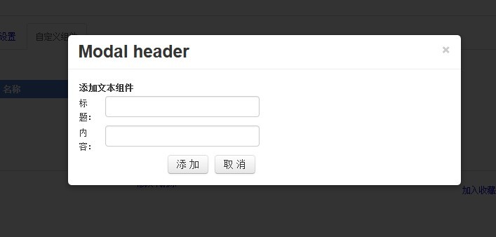 <input id="btntext" type="button" value="添加文本組件" data-toggle="modal" data-target="#myModal" href="../SysManage/ZuJianManage.aspx"/> <!-- Modal --> <div class="modal hide fade" id="myModal" tabindex="-1" role="dialog"> <div class="modal-header"><button class="close" type="button" data-dismiss="modal">×</button> <h3 id="myModalLabel">Modal header</h3> </div> <div class="modal-body"></div> </div>