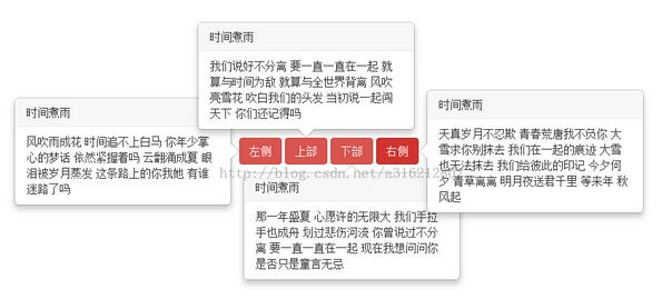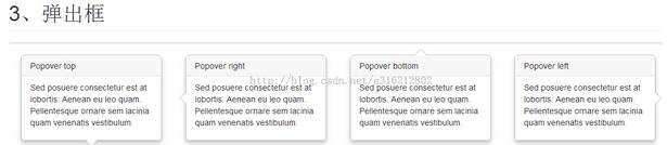 <h1 class="page-header">3、彈出框</h1> <div class="bs-example bs-example-popover"> <div class="popover top"> <div class="arrow"></div> <h3 class="popover-title">Popover top</h3> <div class="popover-content"> <p>Sed posuere consectetur est at lobortis. Aenean eu leo quam. Pellentesque ornare sem lacinia quam venenatis vestibulum.</p> </div> </div> <div class="popover right"> <div class="arrow"></div> <h3 class="popover-title">Popover right</h3> <div class="popover-content"> <p>Sed posuere consectetur est at lobortis. Aenean eu leo quam. Pellentesque ornare sem lacinia quam venenatis vestibulum.</p> </div> </div> <div class="popover bottom"> <div class="arrow"></div> <h3 class="popover-title">Popover bottom</h3> <div class="popover-content"> <p>Sed posuere consectetur est at lobortis. Aenean eu leo quam. Pellentesque ornare sem lacinia quam venenatis vestibulum.</p> </div> </div> <div class="popover left"> <div class="arrow"></div> <h3 class="popover-title">Popover left</h3> <div class="popover-content"> <p>Sed posuere consectetur est at lobortis. Aenean eu leo quam. Pellentesque ornare sem lacinia quam venenatis vestibulum.</p> </div> </div> </div>