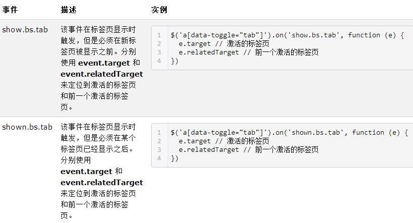 下表列出了標簽頁(Tab)插件中要用到的事件。這些事件可在函數中當鉤子使用。