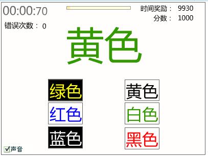 游戲目標: 按畫面中出現的文字的顏色來選擇顏色,千萬不要被顏色的困局打擾,眼睛一定要放亮哦,游戲開始時會有10分,每答對一題得一分,總共有10分,時間用完游戲會結束。
