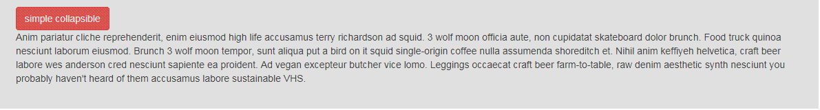 <div class="container" style="margin-top:140px;"> <button type="button" class="btn btn-danger" data-toggle="collapse" data-target="#demo"> simple collapsible </button> <div id="demo" class="collapse in">Anim pariatur cliche reprehenderit, enim eiusmod high life accusamus terry richardson ad squid. 3 wolf moon officia aute, non cupidatat skateboard dolor brunch. Food truck quinoa nesciunt laborum eiusmod. Brunch 3 wolf moon tempor, sunt aliqua put a bird on it squid single-origin coffee nulla assumenda shoreditch et. Nihil anim keffiyeh helvetica, craft beer labore wes anderson cred nesciunt sapiente ea proident. Ad vegan excepteur butcher vice lomo. Leggings occaecat craft beer farm-to-table, raw denim aesthetic synth nesciunt you probably haven't heard of them accusamus labore sustainable VHS.</div>