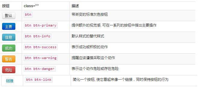 <div class="container"> <button type="button" class="btn btn-default btn-block">Default</button> <button type="button" class="btn btn-primary btn-block">Primary</button> <button type="button" class="btn btn-success">Success</button> <button type="button" class="btn btn-info">Info</button> <button type="button" class="btn btn-warning">Warning</button> <button type="button" class="btn btn-danger">Danger</button> <button type="button" class="btn btn-link">鏈接</button> <a class="btn btn-default" href="#" role="button">Link</a> <button class="btn btn-default" type="submit">Button</button> <input class="btn btn-default" type="button" value="Input"> <input class="btn btn-default" type="submit" value="Submit"> </div>