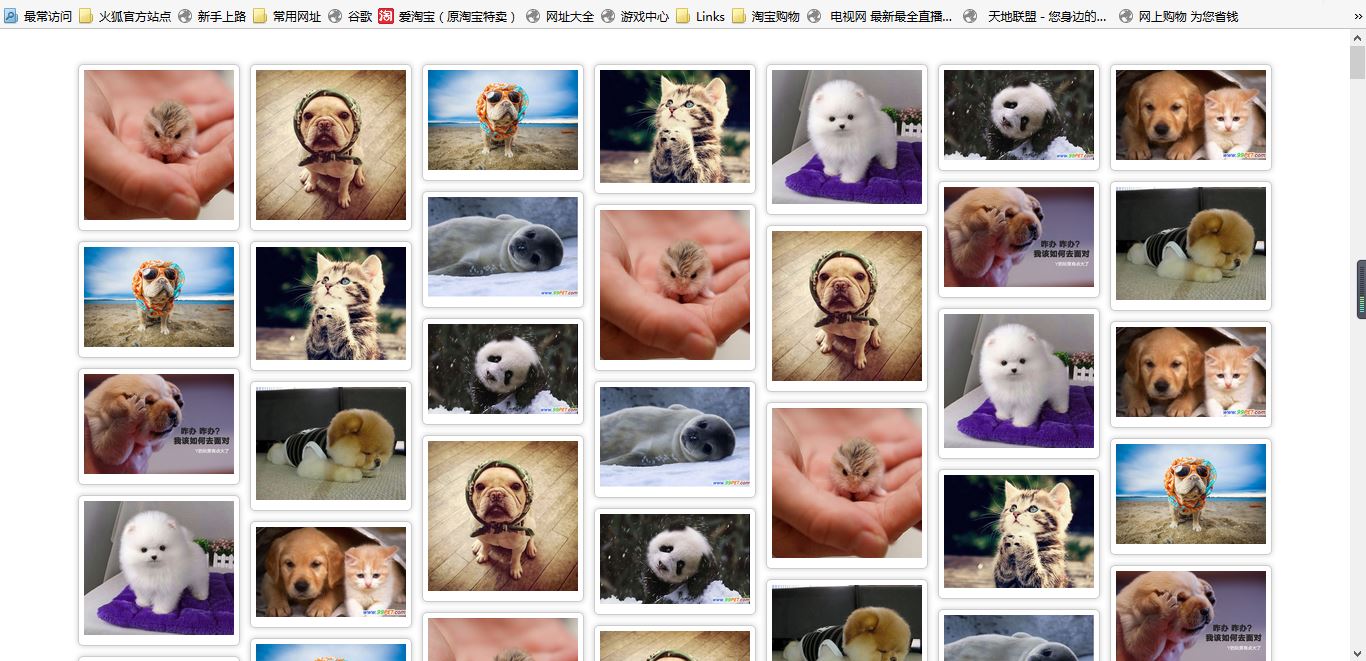 放置圖片的位置:獲得第一行圖片的高度並且存放在數組裡面,接下來的圖片設置position為absolute,放置在高度最小的圖片的下面,然後設置top和left,並且把數組的最小值加上新放置的圖片的高度。也就是說HTML裡面原始放置的圖片除了第一行以外,其他的圖片都是在js裡面又重新定位的。