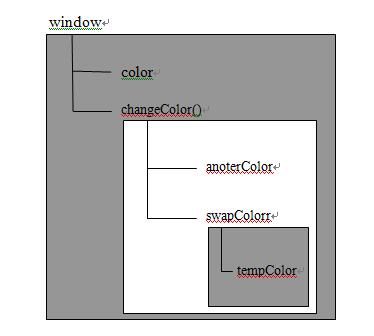 圖中的矩形表示特定的執行環境。我們可以看到變量tempColor只能在swapColor()環境中訪問到,而在changeColor()的局部環境還是全局環境中都無法訪問到它。因此我們可以得到一個結論:內部的環境可以通過作用域鏈訪問所有的外部環境,但外部的環境無法訪問內部的環境中的任何變量和函數。每個環境都可以向上搜索作用域鏈,以查詢變量和函數名;但是任何環境都不能通過向下搜索作用域而進入另一個執行環境。