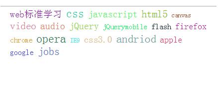 <div id="wrap"> <a href="#">web標准學習</a> <a href="#">css</a> <a href="#">javascript</a> <a href="#">html5</a> <a href="#">canvas</a> <a href="#">video</a> <a href="#">audio</a> <a href="#">jQuery</a> <a href="#">jQuerymobile</a> <a href="#">flash</a> <a href="#">firefox</a> <a href="#">chrome</a> <a href="#">opera</a> <a href="#">IE9</a> <a href="#">css3.0</a> <a href="#">andriod</a> <a href="#">apple</a> <a href="#">google</a> <a href="#">jobs</a> </div>