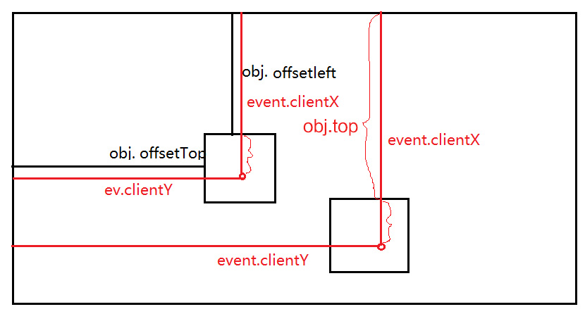 說明:藍色框為屏幕寬高,黑色粗框為浏覽器可視區寬高(浏覽器縮小效果),黑色細框為鼠標要拖拽的對象,如圖可知,獲取鼠標的坐標,可以用event.clientX,event.clientY來獲取,哦了;