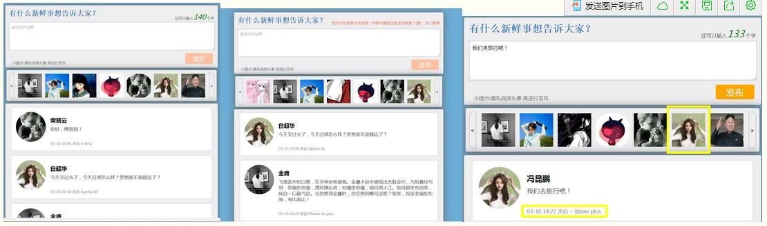 獲取到所有頭像的src之後,存入到一個變量中,當點擊頭像時候,將頭像的src賦予添加元素的img,動態創建日期對象,手機型號,姓名存到數組,采用生成隨機數的方式獲取,當文本框有了內容並且選取頭像後,可以發布成功,發布時候淡出效果,創建一個li,添加li的時候 不能直接采用 appendChild,這回直接添加到已有元素的後邊,而微博效果是插入到前頭,這是需要判斷一下,當有元素時候采用 insertBefore方法,當沒有元素時候采取appendChild。
