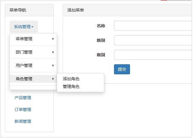 2 插入對應的HTML代碼塊,本例子沒有使用遞歸生成代碼,使用了靜態的三級結構,這樣看著更清晰,真正的生產環境建議使用遞歸去生產菜單