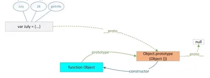 當使用這種方式創建一個對象的時候,原型鏈就變成下圖了. July對象的原型是”Object.prototype”也就是說對象的構建方式會影響原型鏈的形式。