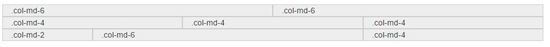 <div class="container"> <div class="row"> <div class="col-md-6">.col-md-6</div> <div class="col-md-6">.col-md-6</div> </div> <div class="row"> <div class="col-md-4">.col-md-4</div> <div class="col-md-4">.col-md-4</div> <div class="col-md-4">.col-md-4</div> </div> <div class="row"> <div class="col-md-2">.col-md-2</div> <div class="col-md-6">.col-md-6</div> <div class="col-md-4">.col-md-4</div> </div> </div>