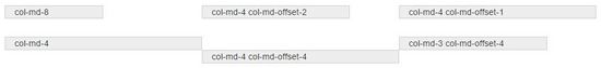 <div class="container"> <div class="row"> <div class="col-md-2 ">col-md-8 </div> <div class="col-md-3 col-md-offset-2">col-md-4 col-md-offset-2</div> <div class="col-md-4 col-md-offset-1">col-md-4 col-md-offset-1</div> </div> <p><br></p> <div class="row"> <div class="col-md-4 ">col-md-4 </div> <div class="col-md-3 col-md-offset-4">col-md-3 col-md-offset-4</div> <div class="col-md-4 col-md-offset-4">col-md-4 col-md-offset-4</div> </div> </div>