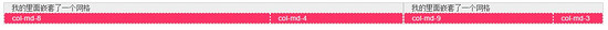 <div class="container"> <div class="row"> <div class="col-md-8"> 我的裡面嵌套了一個網格 <div class="row"> <div class="col-md-8">col-md-8</div> <div class="col-md-4">col-md-4</div> </div> </div> <div class="col-md-4"> 我的裡面嵌套了一個網格 <div class="row"> <div class="col-md-9">col-md-9</div> <div class="col-md-3">col-md-3</div> </div> </div> </div> </div>
