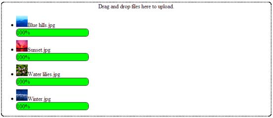 首先,我們需要創建一個目標容器用來接收拖拽事件,添加一個 div 元素即可。然後用一個列表來展示上傳文件的縮略圖,進度條及文件名。參見清單 8 的 HTML 代碼和圖 3 的效果圖。詳細代碼請參見附件中的 dnd.html 文件。