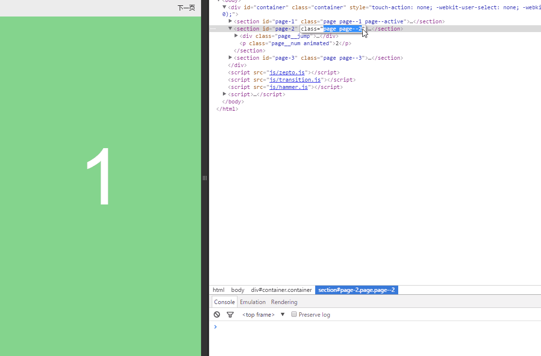 第一步,找到下一頁的section,添加page--next類,將它定位當前頁的右邊,為滑屏做准備;