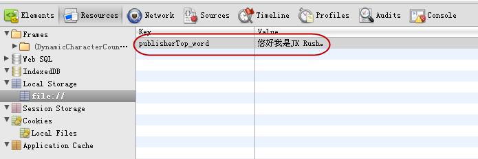 首先,我們打開Chrome的“開發者工具”(Ctr+Shift+I),然後我們選擇“Resources”選項,這時我們就可以看到保存在localStorage中的數據了。