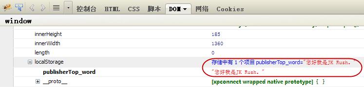 同樣,我們打開Firefox的“Firebug”(F12),然後我們選擇“DOM”選項,這時我們需要查找window的對象localStorage,這樣就可以看到保存在localStorage中的數據了。