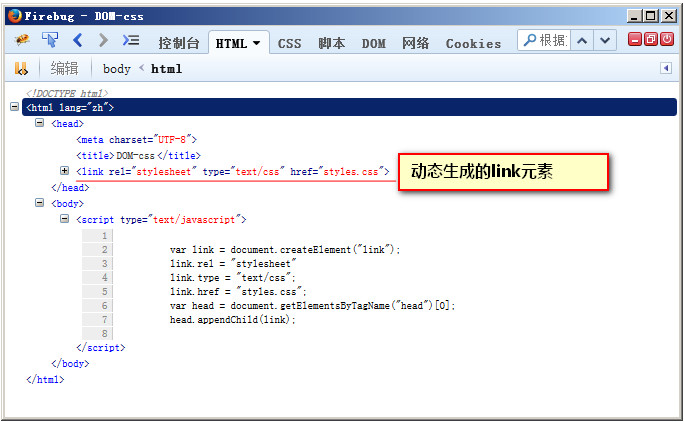 上面的代碼執行後可以在<head>元素中動態添加下面的節點: