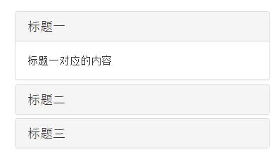 <div class="panel-group" id="accordion"> <div class="panel panel-default"> <div class="panel-heading"> <h4 class="panel-title"><a data-toggle="collapse" data-parent="#accordion" href="#collapseOne">標題一</a></h4> </div> <div id="collapseOne" class="panel-collapse collapse in"> <div class="panel-body">標題一對應的內容</div> </div> </div> <div class="panel panel-default"> <div class="panel-heading"> <h4 class="panel-title"><a data-toggle="collapse" data-parent="#accordion" href="#collapseTwo">標題二</a></h4> </div> <div id="collapseTwo" class="panel-collapse collapse"> <div class="panel-body">標題二對應的內容</div> </div> </div> <div class="panel panel-default"> <div class="panel-heading"> <h4 class="panel-title"><a data-toggle="collapse"data-parent="#accordion"href="#collapseThree">標題三</a></h4> </div> <div id="collapseThree" class="panel-collapse collapse"> <div class="panel-body">標題三對應的內容</div> </div> </div> </div>