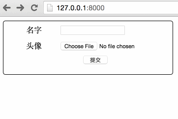 <form method="POST" action="upload" enctype="multipart/form-data"> 名字 <input type="text" name="user"></input> 頭像 <input type="file" name="file"></input> <input type="submit" id="_submit" value="提交"></input> </form>