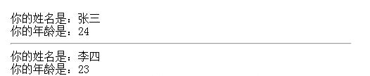 return "你的姓名是:"+name+"<br/>"+"你的年齡是:"+age;