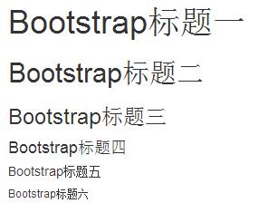 <!--Bootstrap中的標題--> <h1>Bootstrap標題一</h1> <h2>Bootstrap標題二</h2> <h3>Bootstrap標題三</h3> <h4>Bootstrap標題四</h4> <h5>Bootstrap標題五</h5> <h6>Bootstrap標題六</h6> <!--Bootstrap中讓非標題元素和標題使用相同的樣式--> <div class="h1">Bootstrap標題一</div> <div class="h2">Bootstrap標題二</div> <div class="h3">Bootstrap標題三</div> <div class="h4">Bootstrap標題四</div> <div class="h5">Bootstrap標題五</div> <div class="h6">Bootstrap標題六</div>