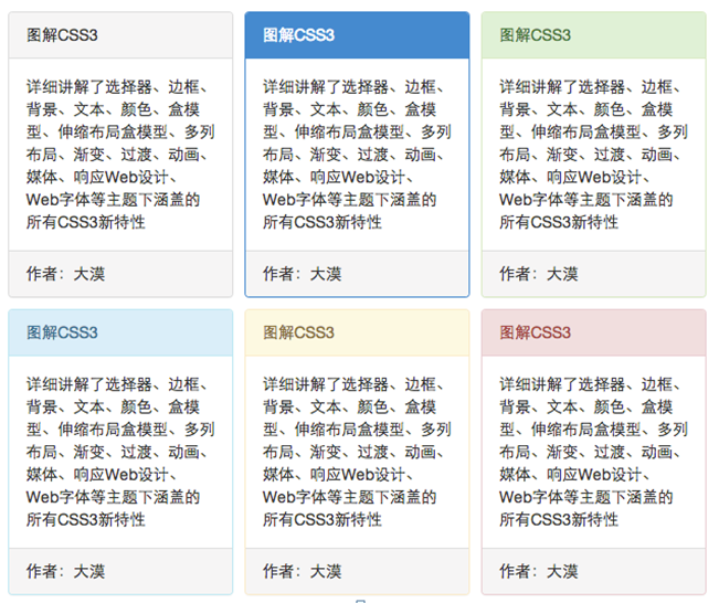 <div class="panel panel-default"> <div class="panel-heading">圖解CSS3</div> <div class="panel-body">…</div> <div class="panel-footer">作者:大漠</div> </div> <div class="panel panel-primary">…</div> <div class="panel panel-success">…</div> <div class="panel panel-info">…</div> <div class="panel panel-warning">…</div> <div class="panel panel-danger">…</div>