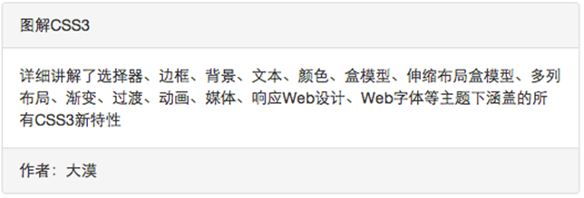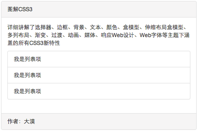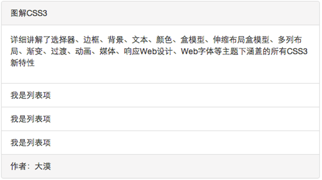 <div class="panel panel-default"> <div class="panel-heading">圖解CSS3</div> <div class="panel-body"> <p>詳細講解了選擇器、邊框、背景、文本、顏色、盒模型、伸縮布局盒模型、多列布局、漸變、過渡、動畫、媒體、響應Web設計、Web字體等主題下涵蓋的所有CSS3新特性 </p> <ul class="list-group"> <li class="list-group-item">我是列表項</li> <li class="list-group-item">我是列表項</li> <li class="list-group-item">我是列表項</li> </ul> </div> <div class="panel-footer">作者:大漠</div> </div>