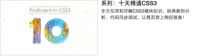<div class="media"> <a class="pull-left" href="#"> <img class="media-object" src="imgs/1.jpg" alt="..."> </a> <div class="media-body"> <h4 class="media-heading">系列:十天精通CSS3</h4> <div>全方位深刻詳解CSS3模塊知識,經典案例分析,代碼同步調試,讓網頁穿上絢麗裝備!</div> </div> </div>