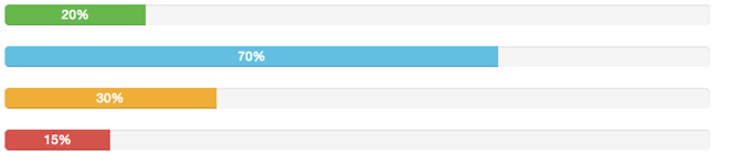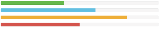 <div class="progress"> <div class="progress-bar progress-bar-success" style="width:40%"></div> </div> <div class="progress"> <div class="progress-bar progress-bar-info" style="width:60%"></div> </div> <div class="progress"> <div class="progress-bar progress-bar-warning" style="width:80%"></div> </div> <div class="progress"> <div class="progress-bar progress-bar-danger" style="width:50%"></div> </div>