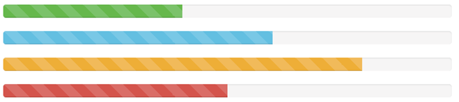 <div class="progress progress-striped active"> <div class="progress-bar progress-bar-success" style="width:40%"></div> </div> <div class="progress progress-striped active"> <div class="progress-bar progress-bar-info" style="width:60%"></div> </div> <div class="progress progress-striped active"> <div class="progress-bar progress-bar-warning" style="width:80%"></div> </div> <div class="progress progress-striped active"> <div class="progress-bar progress-bar-danger" style="width:50%"></div> </div>