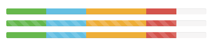 <div class="progress"> <div class="progress-bar progress-bar-success" style="width:20%"></div> <div class="progress-bar progress-bar-info" style="width:20%"></div> <div class="progress-bar progress-bar-warning" style="width:30%"></div> <div class="progress-bar progress-bar-danger" style="width:15%"></div> </div> <div class="progress"> <div class="progress-bar progress-bar-success progress-bar-striped" style="width:20%"></div> <div class="progress-bar progress-bar-info progress-bar-striped" style="width:20%"></div> <div class="progress-bar progress-bar-striped progress-bar-warning" style="width:30%"></div> <div class="progress-bar progress-bar-danger progress-bar-striped" style="width:15%"></div> </div> <div class="progress"> <div class="progress-bar progress-bar-success" style="width:20%"></div> <div class="progress-bar progress-bar-info progress-bar-striped" style="width:20%"></div> <div class="progress-bar progress-bar-warning" style="width:30%"></div> <div class="progress-bar progress-bar-danger progress-bar-striped" style="width:15%"></div> </div>