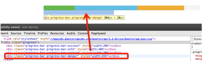 <div class="progress"> <div class="progress-bar progress-bar-success" style="width:20%"></div> <div class="progress-bar progress-bar-info" style="width:10%"></div> <div class="progress-bar progress-bar-warning" style="width:30%"></div> <div class="progress-bar progress-bar-danger" style="width:15%"></div> </div>
