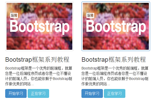 <div class="container"> <div class="row"> <div class="col-xs-6 col-md-3"> <a href="#" class="thumbnail"> <img src="imgs/1.jpg" style="height: 180px; width: 100%; display: block;" alt=""> </a> <div class="caption"> <h3>Bootstrap框架系列教程</h3> <p>Bootstrap框架是一個優秀的前端框,就算您是一位後端程序員或者你是一位不懂設計的前端人員,你也能依賴於Bootstrap制作做優美的網站...</p> <p> <a href="##" class="btn btn-primary">開始學習</a> <a href="##" class="btn btn-info">正在學習</a> </p> </div> </div> … </div> </div>