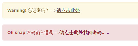 <div class="alert alert-warning" role="alert"> <strong>Warning!</strong> 忘記密碼?---><a href="##" class="alert-link">請點擊此處</a> </div> <div class="alert alert-danger" role="alert"> <strong>Oh snap!</strong> 密碼輸入錯誤---><a href="##" class="alert-link">請點擊此處找回密碼。。</a> </div>