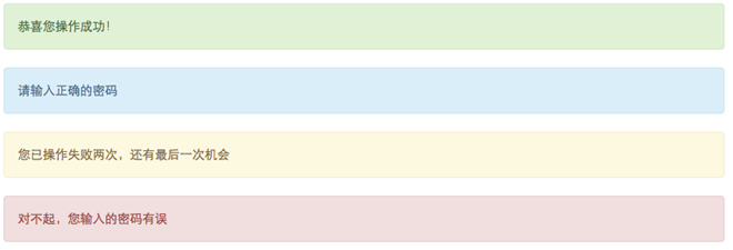<div class="alert alert-success" role="alert">恭喜您操作成功!</div> <div class="alert alert-info" role="alert">請輸入正確的密碼</div> <div class="alert alert-warning" role="alert">您已操作失敗兩次,還有最後一次機會</div> <div class="alert alert-danger" role="alert">對不起,您輸入的密碼有誤</div>