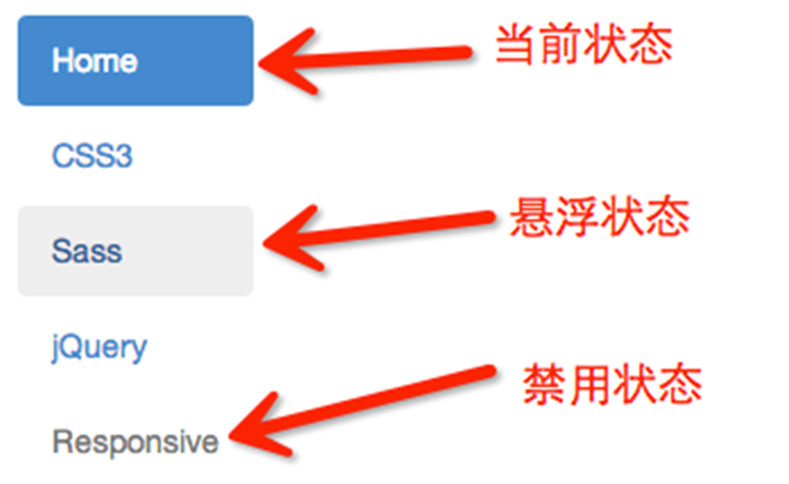 <ul class="nav nav-pills nav-stacked"> <li class="active"><a href="##">Home</a></li> <li><a href="##">CSS3</a></li> <li><a href="##">Sass</a></li> <li><a href="##">jQuery</a></li> <li class="disabled"><a href="##">Responsive</a></li> </ul>