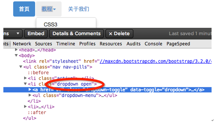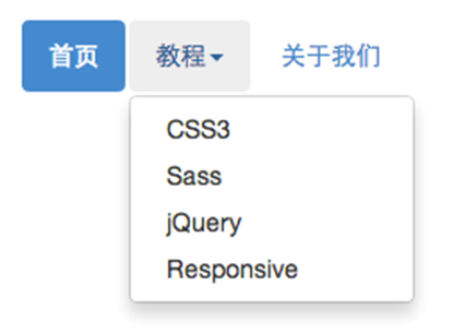 <ul class="nav nav-pills"> <li class="active"><a href="##">首頁</a></li> <li class="dropdown"> <a href="##" class="dropdown-toggle" data-toggle="dropdown">教程<span class="caret"></span></a> <ul class="dropdown-menu"> <li><a href="##">CSS3</a></li> … </ul> </li> <li><a href="##">關於我們</a></li> </ul>
