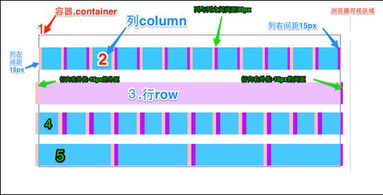 3、2號橫條闡述的是,將容器的行(.row)平分了12等份,也就是列。每個列都有一個“padding-left:15px”(圖中粉紅色部分)和一個“padding-right:15px”(圖中紫色部分)。這樣也導致了第一個列的padding-left和最後一列的padding-right占據了總寬度的30px,從而致使頁面不美觀,當然,如果你需要留有一定的間距,這個做法是不錯的。如bootstrap.css中第767行~第772行所示: