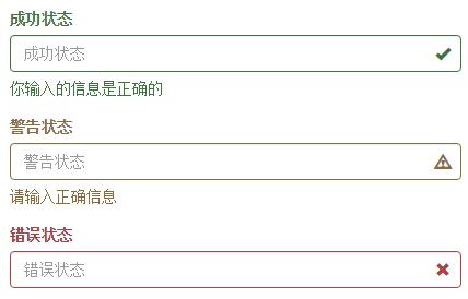 <form role="form"> <div class="form-group has-success has-feedback"> <label class="control-label" for="inputSuccess1">成功狀態</label> <input type="text" class="form-control" id="inputSuccess1" placeholder="成功狀態" > <span class="help-block">你輸入的信息是正確的</span> <span class="glyphicon glyphicon-ok form-control-feedback"></span> </div> <div class="form-group has-warning has-feedback"> <label class="control-label" for="inputWarning1">警告狀態</label> <input type="text" class="form-control" id="inputWarning1" placeholder="警告狀態"> <span class="help-block">請輸入正確信息</span> <span class="glyphicon glyphicon-warning-sign form-control-feedback"></span> </div> <div class="form-group has-error has-feedback"> <label class="control-label" for="inputError1">錯誤狀態</label> <input type="text" class="form-control" id="inputError1" placeholder="錯誤狀態"> <span class="glyphicon glyphicon-remove form-control-feedback"></span> </div> </form>