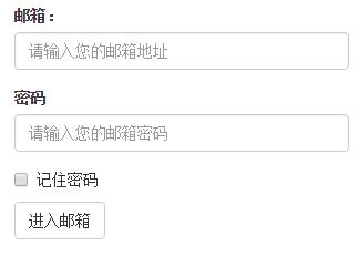 <form > <div class="form-group"> <label>郵箱:</label> <input type="email" class="form-control" placeholder="請輸入您的郵箱地址"> </div> <div class="form-group"> <label >密碼</label> <input type="password" class="form-control" placeholder="請輸入您的郵箱密碼"> </div> <div class="checkbox"> <label> <input type="checkbox"> 記住密碼 </label> </div> <button type="submit" class="btn btn-default">進入郵箱</button> </form>