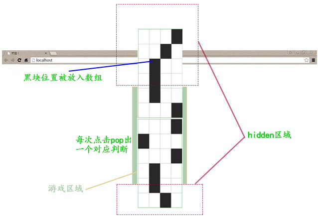 程序思路:如圖:將游戲區域的CSS設置為相對定位、溢出隱藏;兩塊“游戲板”上分別排布著24塊方格,黑色每行隨機產生一個,“游戲板”向下滾動並交替顯示,將每個操作板的黑塊位置存入數組,每次點擊時將數組pop出來進行比對(我覺得亮點在這……)。
