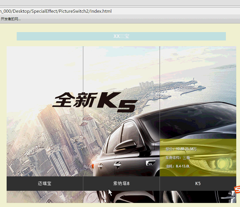 <div id="menuWrapper" class="menuWrapper bg1"> <ul class="menu" id="menu"> <li class="bg1" style="background-position:0 0;"> <a id="bg1" href="#">邁瑞寶</a> <ul class="sub1" style="background-position:0 0;"> <li><a href="#">報價:11.99-23.69萬</a></li> <li><a href="#">車身結構:三箱</a></li> <li><a href="#">油耗:8.3-12.0L</a></li> </ul> </li> <li class="bg1" style="background-position:-266px 0px;"> <a id="bg2" href="#">索納塔8</a> <ul class="sub2" style="background-position:-266px 0;"> <li><a href="#">報價:13.39-22.59萬</a></li> <li><a href="#">車身結構:三箱</a></li> <li><a href="#">油耗:9.0-12.0L</a></li> </ul> </li> <li class="last bg1" style="background-position:-532px 0px;"> <a id="bg3" href="#">K5</a> <ul class="sub3" style="background-position:-266px 0;"> <li><a href="#">報價:10.88-25.58萬</a></li> <li><a href="#">車身結構:三箱</a></li> <li><a href="#">油耗:8.4-13.0L</a></li> </ul> </li> </ul> </div>