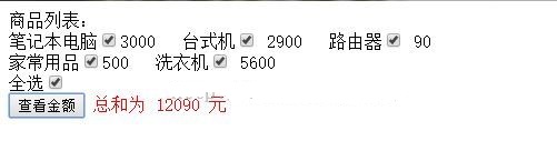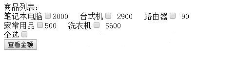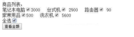 <body> 商品列表:<br/> 筆記本電腦<input type="checkbox" name="mm" value="3000" onclick="chose(this)" />3000 台式機<input type="checkbox" onclick="chose(this)" name="mm" value="2900"/> 2900 路由器<input type="checkbox" onclick="chose(this)" name="mm" value="90"/> 90 <br/> 家常用品<input type="checkbox" onclick="chose(this)" name="mm" value="500"/>500 洗衣機<input type="checkbox" onclick="chose(this)" name="mm" value="5600"/> 5600 <br/>全選<input type="checkbox" name="all" onclick="allCheck(this)" /> <br/><input type="button" value="查看金額" name="btn" onclick="sumall()"/> <span id="spanid"></span> </body>