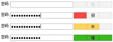 <input name="password" type="PassWord" onKeyUp="CheckIntensity(this.value)"> <table border="0" cellpadding="0" cellspacing="0"> <tr align="center"> <td id="pwd_Weak" class="pwd pwd_c"> </td> <td id="pwd_Medium" class="pwd pwd_c pwd_f">無</td> <td id="pwd_Strong" class="pwd pwd_c pwd_c_r"> </td> </tr> </table>