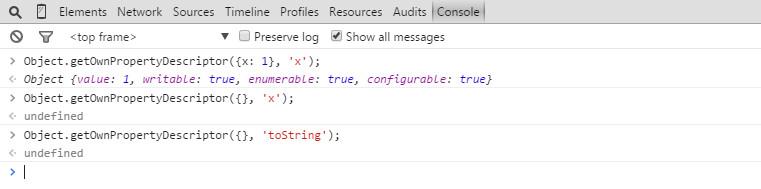 從函數名字就可以看出,Object.getOwnPropertyDescriptor()只能得到自有屬性的描述符,對於繼承屬性和不存在的屬性它都返回undefined。要想獲得繼承屬性的特性,需要遍歷原型鏈(不會遍歷原型鏈?不要急,下面會說到的)。