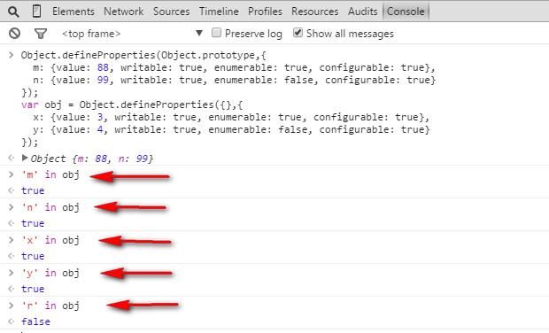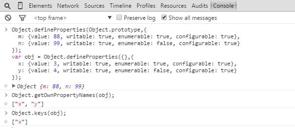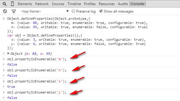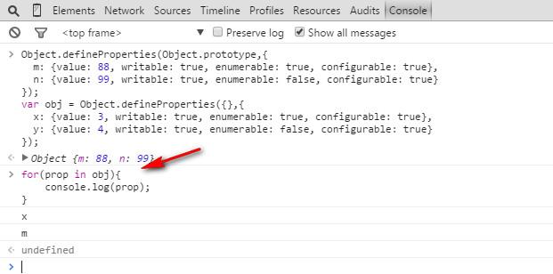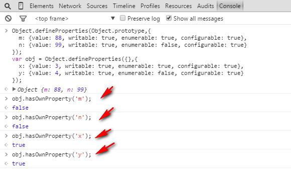 為了試驗,我們先給對象Object.prototype添加一個可枚舉屬性m,一個不可枚舉屬性n;然後,給對象obj定義兩個可枚舉屬性x,一個不可枚舉屬性y,並且對象obj是通過對象直接量形式創建的,繼承了Object.prototype。下面看實例: