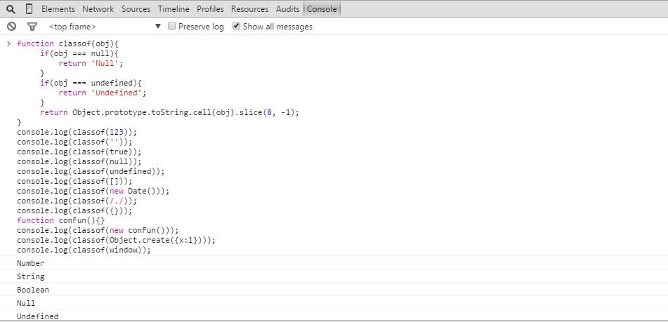 對象的類屬性(class attribute)是一個字符串,用以表示對象的類型信息。ECMAScript 3 和ECMAScript 5 都未提供設置這個屬性的方法,並只有一種間接的方法可以查詢它。默認的toString()方法(繼承自Object.prototype)返回了這種格 式的字符串:[object class] 。因此,要想獲得對象的類,可以調用對象的toString()方法,然後提取已返回字符串的第8到倒數第二個位置之間的字符。不過,很多對象繼承的 toString()方法重寫了(比如:Array、Date等),為了能調用正確的toString()版本,必須間接地調用 Function.call()方法。下面代碼可以返回傳遞給它的任意對象的類: