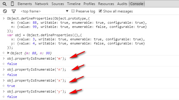 為了試驗,我們先給對象Object.prototype添加一個可枚舉屬性m,一個不可枚舉屬性n;然後,給對象obj定義兩個可枚舉屬性x,一個不可枚舉屬性y,並且對象obj是通過對象直接量形式創建的,繼承了Object.prototype。下面看實例: